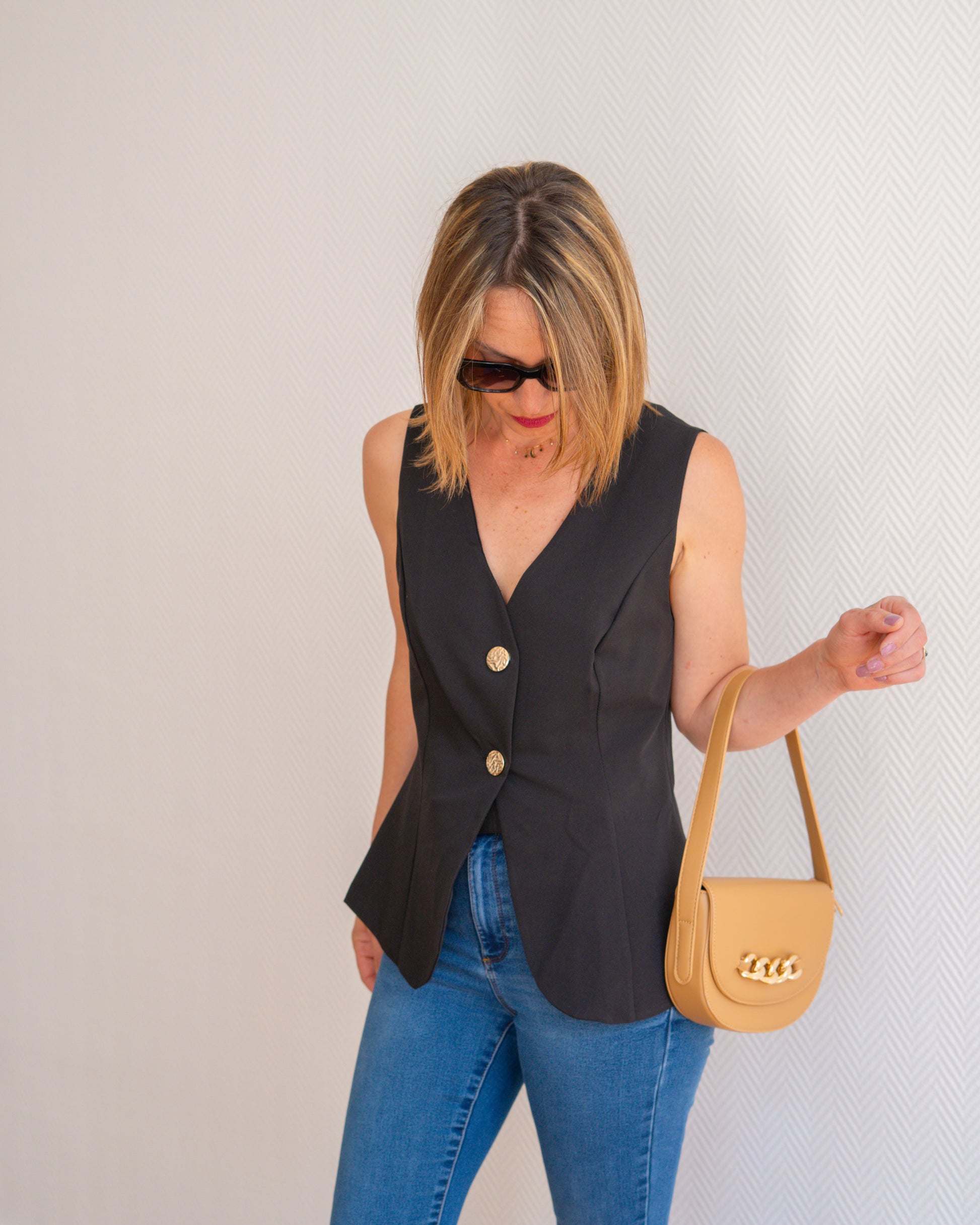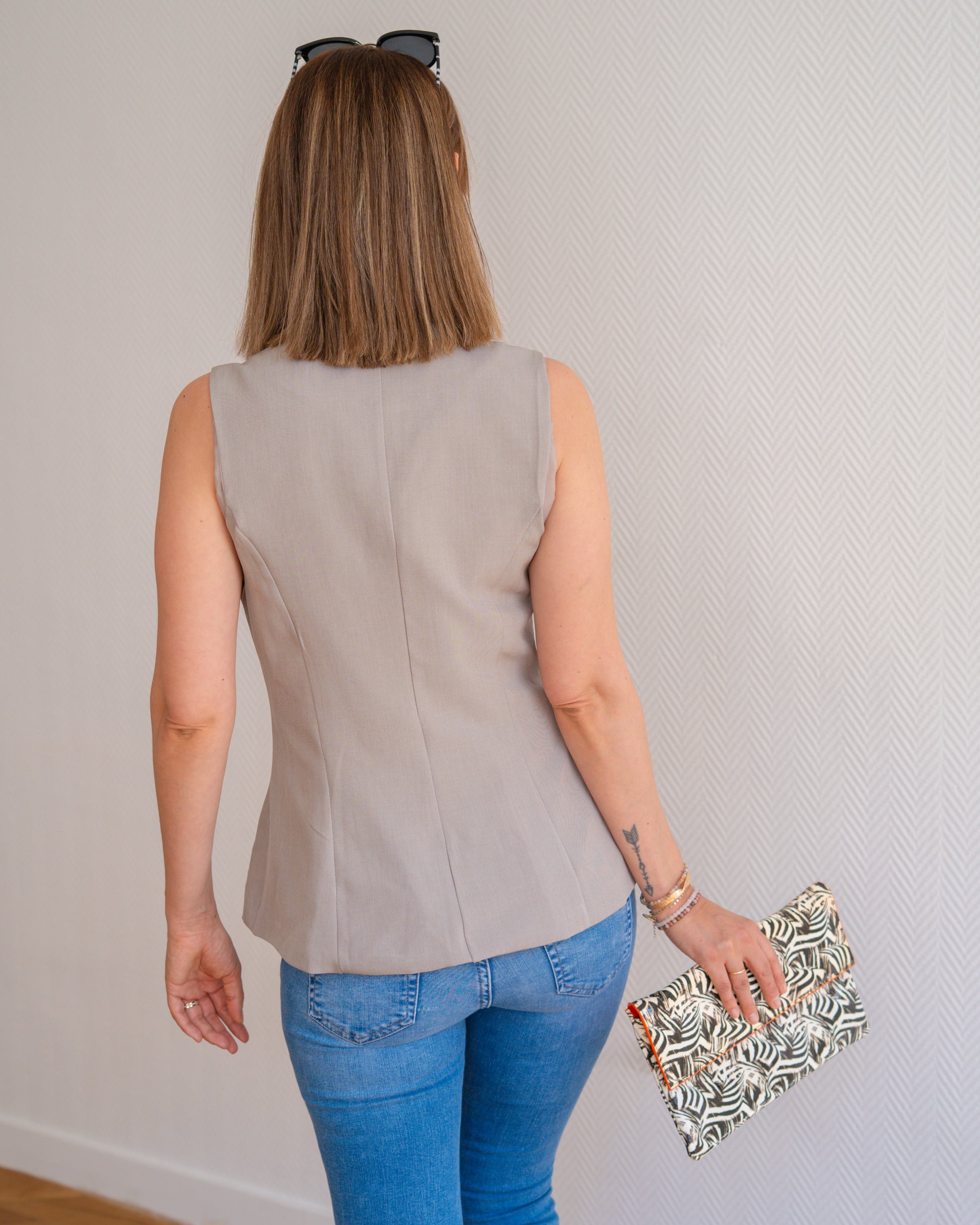 Ce top sans manches, élégant et raffiné, se distingue par ses boutons dorés bijoux qui apportent une touche de luxe discrète. Parfait pour compléter une tenue chic, il peut être porté en toute occasion pour un look à la fois simple et sophistiqué.